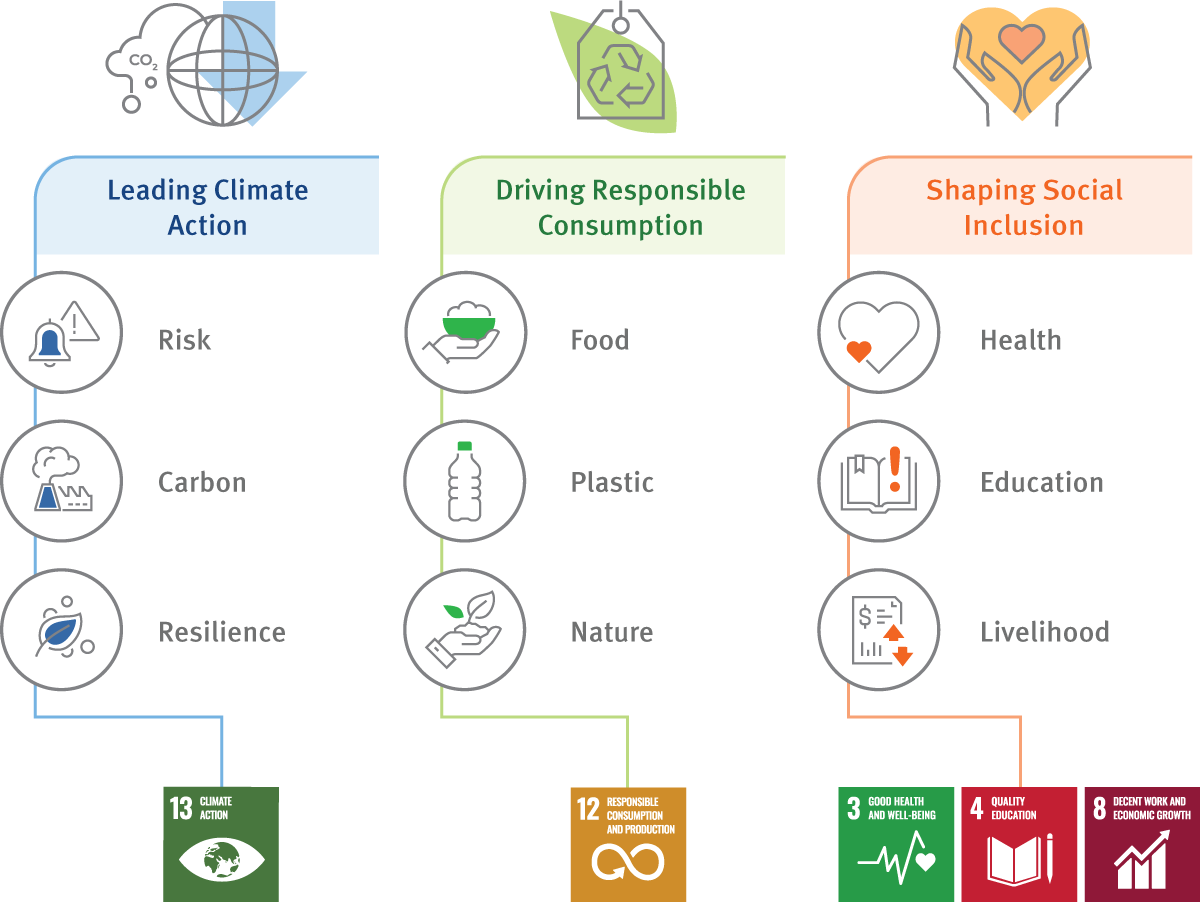 The Group’s sustainability strategy, Building Towards 2030, is informed by the Group’s response to social and environmental megatrends shaping the future of our business and the communities in which we operate. It is built on nine focus areas under three strategic pillars: Leading Climate Action, Driving Responsible Consumption and Shaping Social Inclusion. Demonstrating our commitment to support the global agenda to end poverty, protect the planet and ensure that all people enjoy peace and prosperity by 2030, our sustainability strategy is aligned with five of the 17 United Nations Sustainable Development Goals (‘UNSDGs’).
