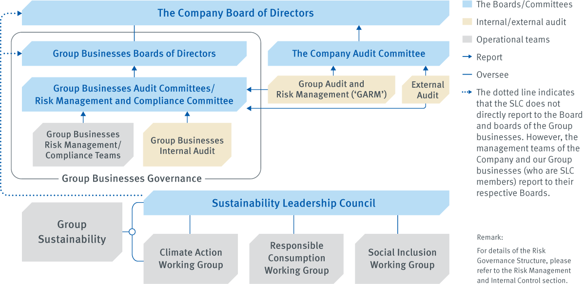 Meeting twice a year, the SLC serves as a collaboration platform for the senior management from across the Group to exchange insights and perspectives on sustainability strategy, planning and direction for the Group. Material sustainability issues are communicated and discussed at the SLC, and the Group’s sustainability strategy and policies are further refined with input from the management teams of our Group businesses. The SLC provides opportunities for the Group and our businesses to regularly share best practices and discuss Group-wide sustainability (including climate) risks and opportunities, with the aim of improving the Group’s performance and ensuring consistent integration of sustainability considerations into corporate policies and business operations.