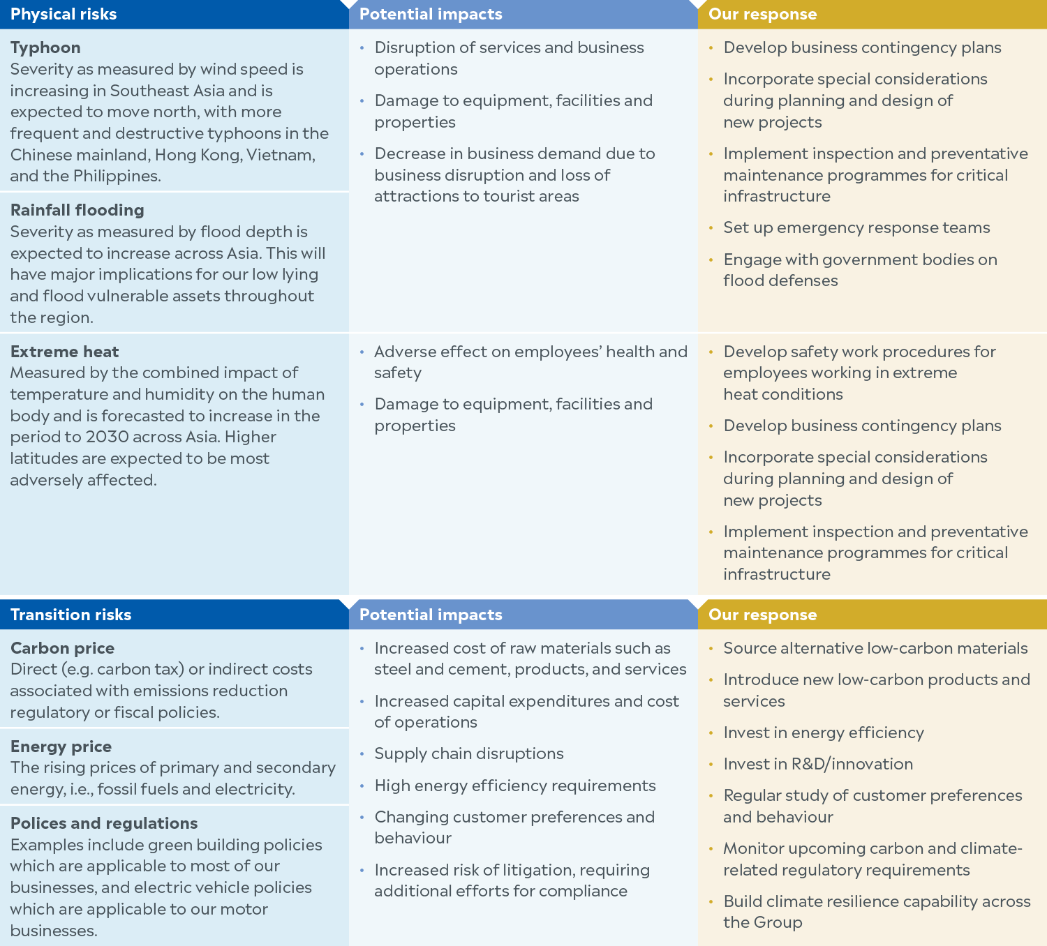In 2021, we completed a preliminary study of physical risks likely to have a material impact on the Group, through asset damage and business disruption. We analysed the exposure and impact of acute1 and chronic2 hazards on more than 800 significant assets across our Group businesses in 22 countries and regions, under three Representative Concentration Pathways (‘RCPs’) developed by the Intergovernmental Panel on Climate Change (‘IPCC’)3. Our top identified climate hazards, their corresponding impacts and mitigation measures are summarised in the table below.